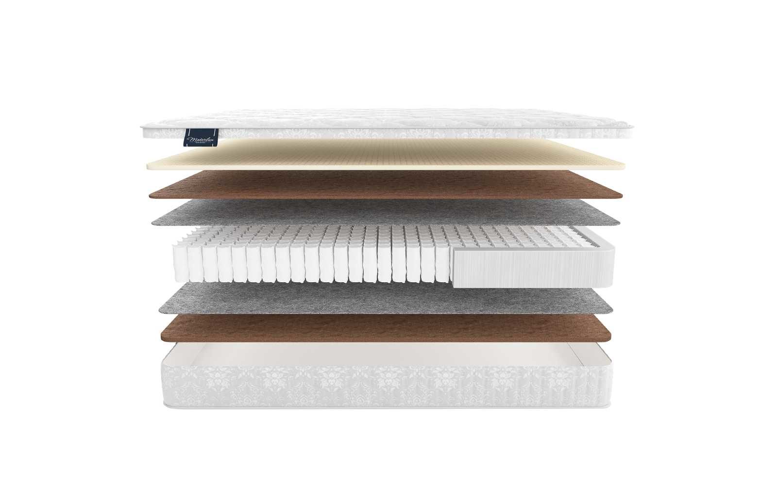 Периметр матраса укреплён коробом из пены высокой плотности, а пружинный блок разделён с наполнителями прослойкой термофиксированного фетра. Благодаря таким нюанса модель лучше переносит нагрузки и меньше изнашивается.