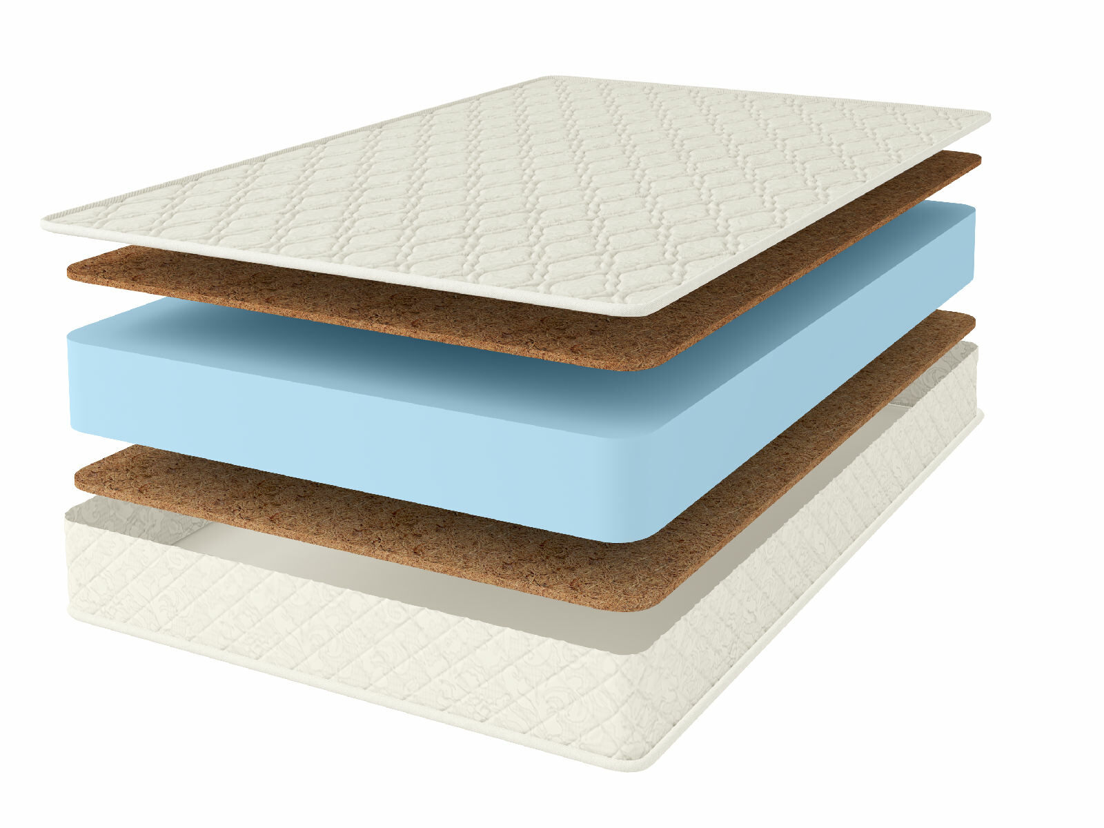 Высокую жёсткость матрасу обеспечивает наполнитель кокосовая койра. Он проложен с обоих сторон изделия. Материал представляет собой жёсткую плиту, которую получают из волокон кокоса. Структура наполнителя позволяет пропускать воздух, не удерживать влагу и главное – противостоять микроорганизмам, койра не поддаётся гниению, благодаря своим уникальным свойствам.