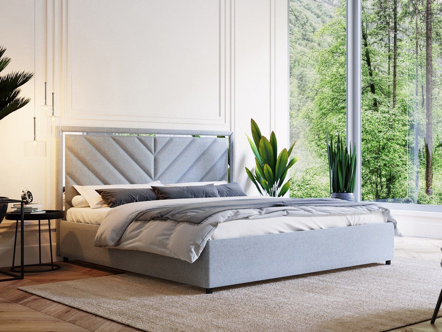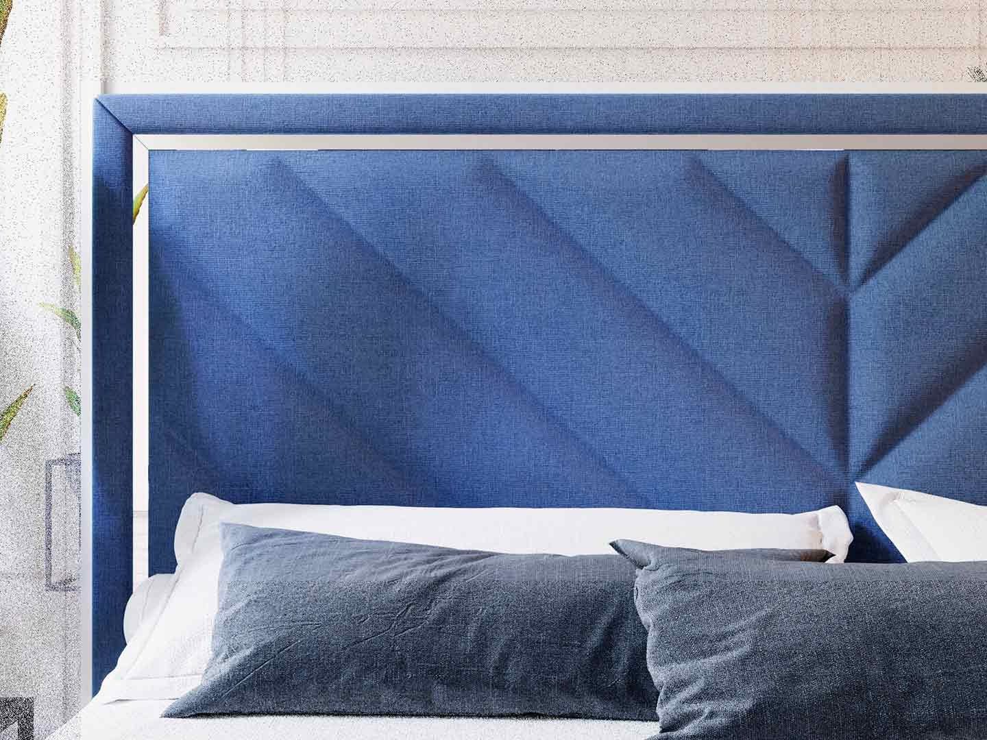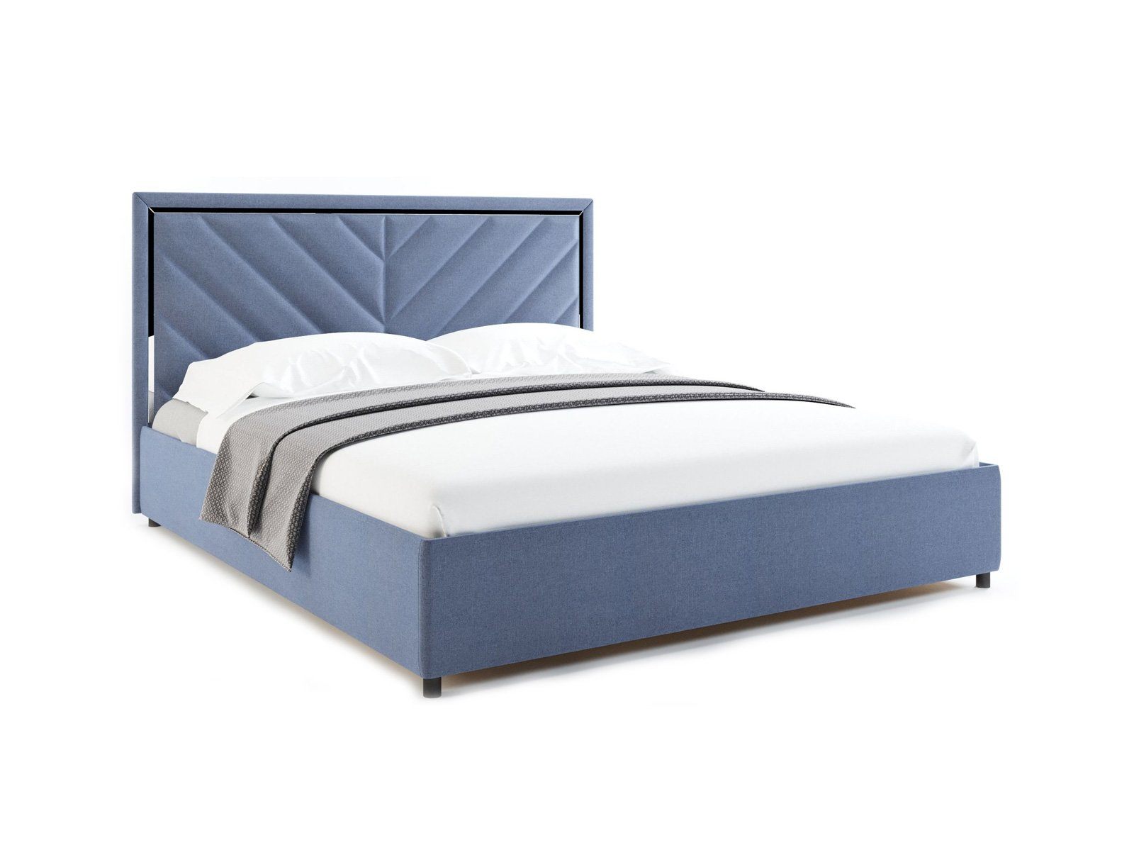 Виктория — кровать с высоким изголовьем в современном стиле. Изюминка модели — высокое мягкое изголовье с диагональными стяжками и зеркальной вставкой по периметру, которая создает яркие блики на свету.
