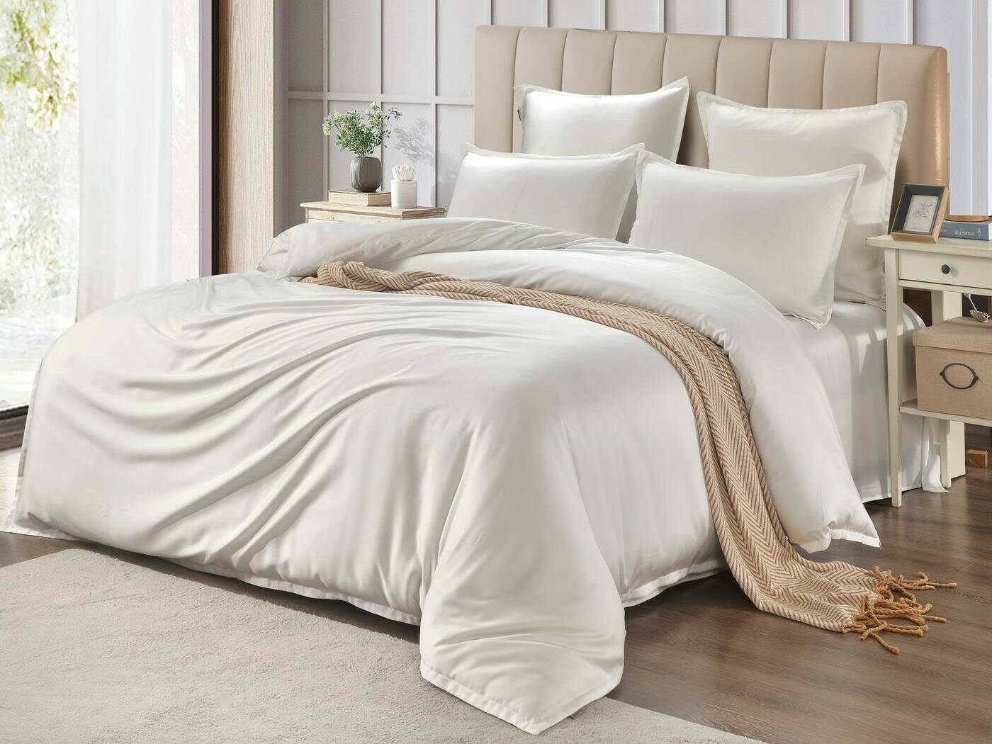 Комплекты постельного белья Ансель: нежность и комфорт каждую ночь Ищете постельное бельё, которое подарит вам незабываемый комфорт и уют? Тогда комплекты постельного белья Ансель из тенселя — идеальный выбор! Тенсель — это натуральная ткань, изготовленная из волокон эвкалипта. Она обладает рядом преимуществ перед хлопковыми тканями: более нежная, шелковистая и приятная на ощупь. Комплекты постельного белья Ансель включают в себя наволочки, простыню и пододеяльник. Они выполнены из 100% тенселя, что гарантирует высокое качество и долговечность. Одно из главных преимуществ тенселя — его способность пропускать воздух и хорошо впитывать и испарять влагу. Это обеспечивает оптимальный микроклимат во время сна, предотвращает появление неприятных запахов и бактерий. Ещё одно важное свойство тенселя — антибактериальный эффект. Это значит, что постельное бельё Ансель не вызывает аллергии и подходит для людей с чувствительной кожей. Уникальное свойство тенселя — климат-контроль. При высокой температуре в помещении ткань обладает лёгким и приятным охлаждающим эффектом, а при низкой создаёт ощущение тепла и комфорта. Комплекты постельного белья Ансель — это идеальный выбор для тех, кто ценит комфорт, качество и натуральность. Они станут отличным дополнением к вашему интерьеру и подарят вам незабываемые ощущения во время сна.