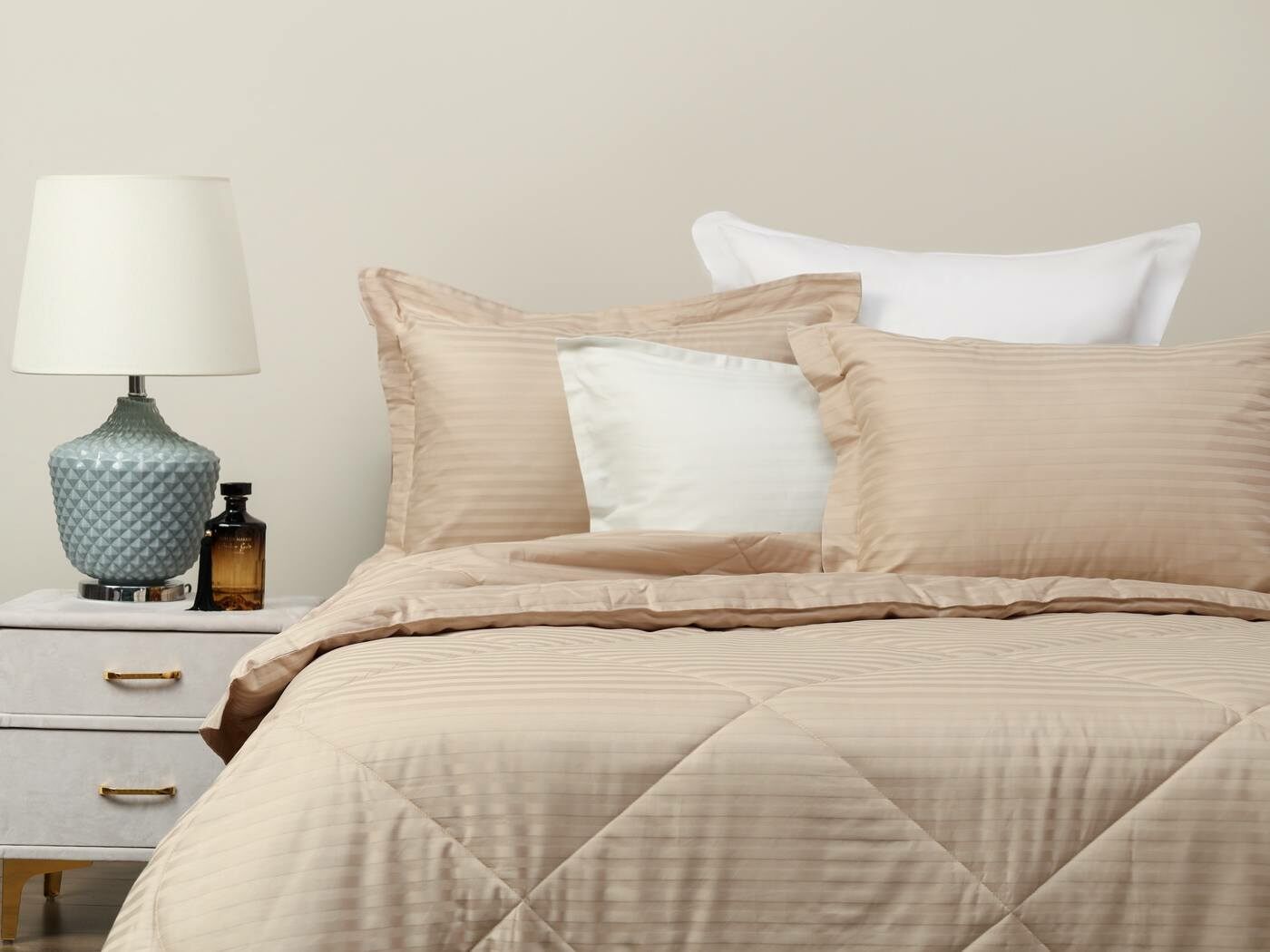 Одеяло очень удобно в использовании, легко стирается и быстро сохнет. Оно универсальное, средней толщины, что позволяет использовать его круглый год. К тому же, оно простегано элегантной стежкой, что не только придает красоты нашим комплектам, но и отлично фиксирует слой наполнителя внутри изделия.