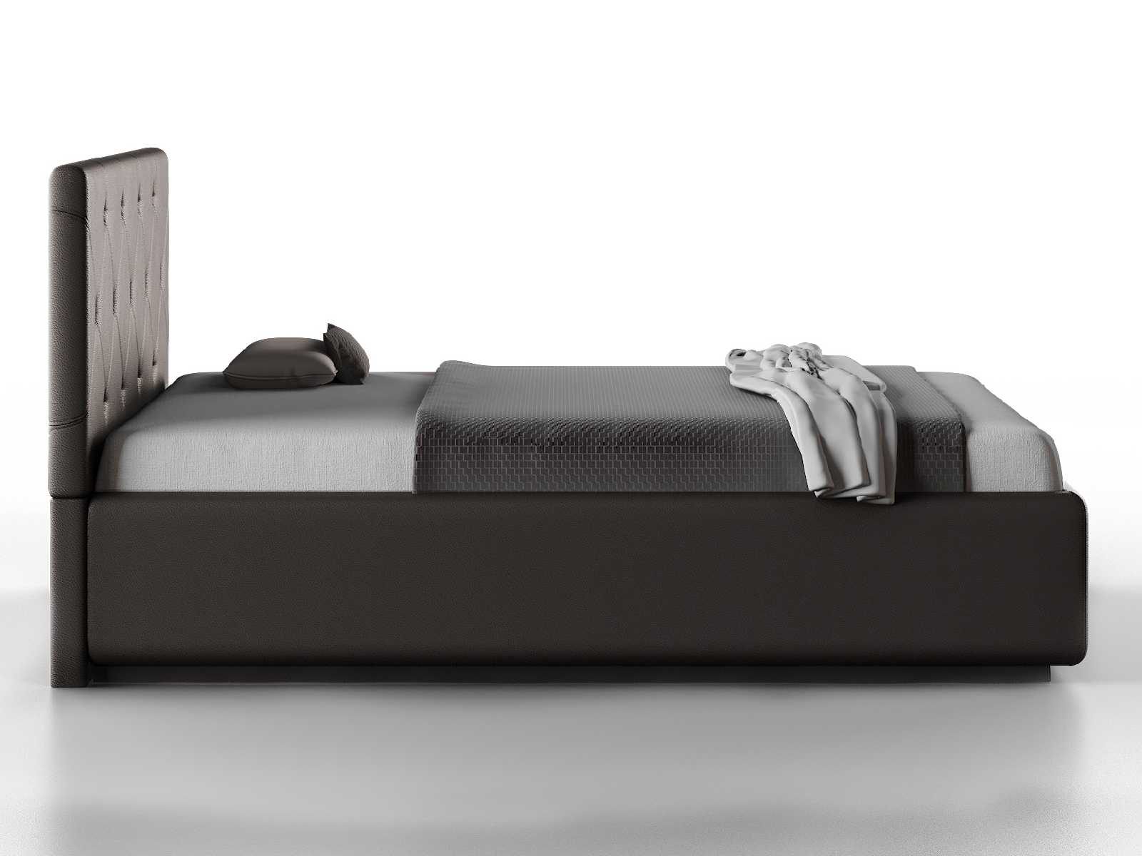 Кровать укомплектована IQ с подъемным механизмом и ящиком для белья без дна (дополнительная платная опция - дно к ящику IQ из HDF (ХДФ). Каркас кровати на цоколе, декоративный чехол на цоколе съёмный. Глубина ящика для белья - 30 см, без ограничения нагрузки на ящик.