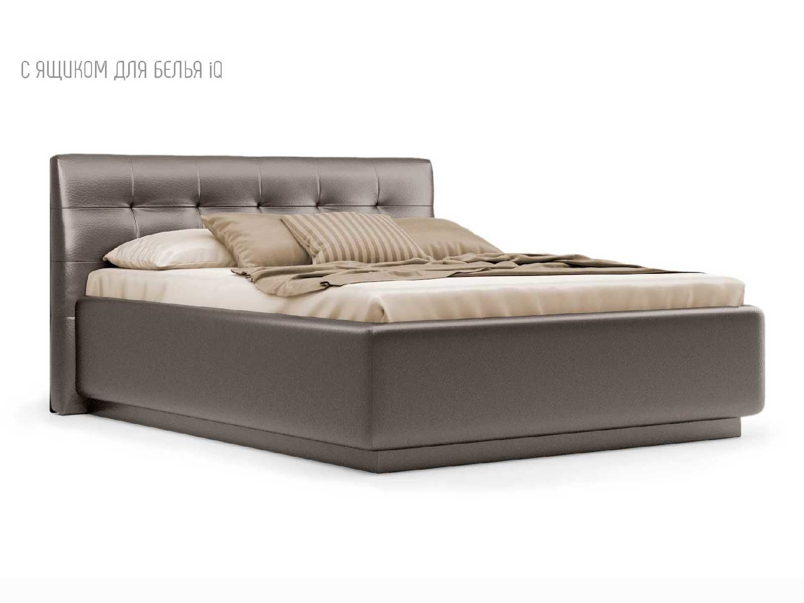 Кровать укомплектована IQ с подъемным механизмом и ящиком для белья без дна (дополнительная платная опция - дно к ящику IQ из HDF (ХДФ). Каркас кровати на цоколе, декоративный чехол на цоколе съёмный. Глубина ящика для белья - 30 см, без ограничения нагрузки на ящик.