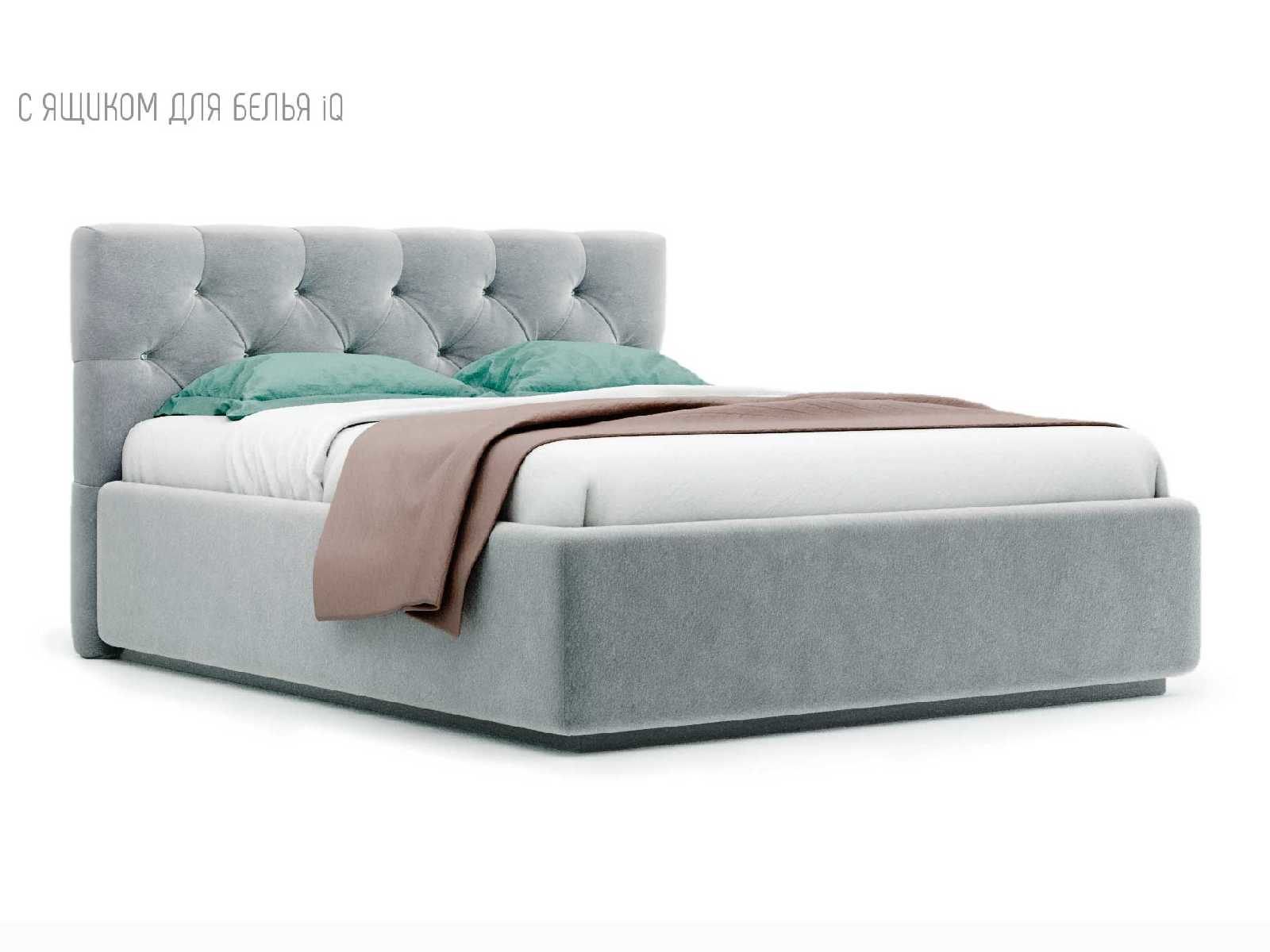 Кровать укомплектована IQ с подъемным механизмом и ящиком для белья без дна (дополнительная платная опция - дно к ящику IQ из HDF (ХДФ). Каркас кровати на цоколе, декоративный чехол на цоколе съёмный. Глубина ящика для белья - 30 см, без ограничения нагрузки на ящик.