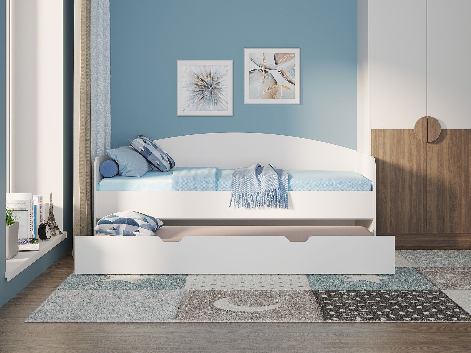 Кровать из ЛДСП с дополнительным выдвижным спальным местом. Выдвижная часть модели может использоваться в качестве дополнительного спального места или вместительного бельевого ящика. Модуль выдвигается с помощью роликов. Возможность полного выдвижения способствует легкой уборке под кроватью. Варианты исполнения: доступна в пяти цветах ЛДСП (белый, графитовый, ясень ориноко, ясмунд и ясень анкор)