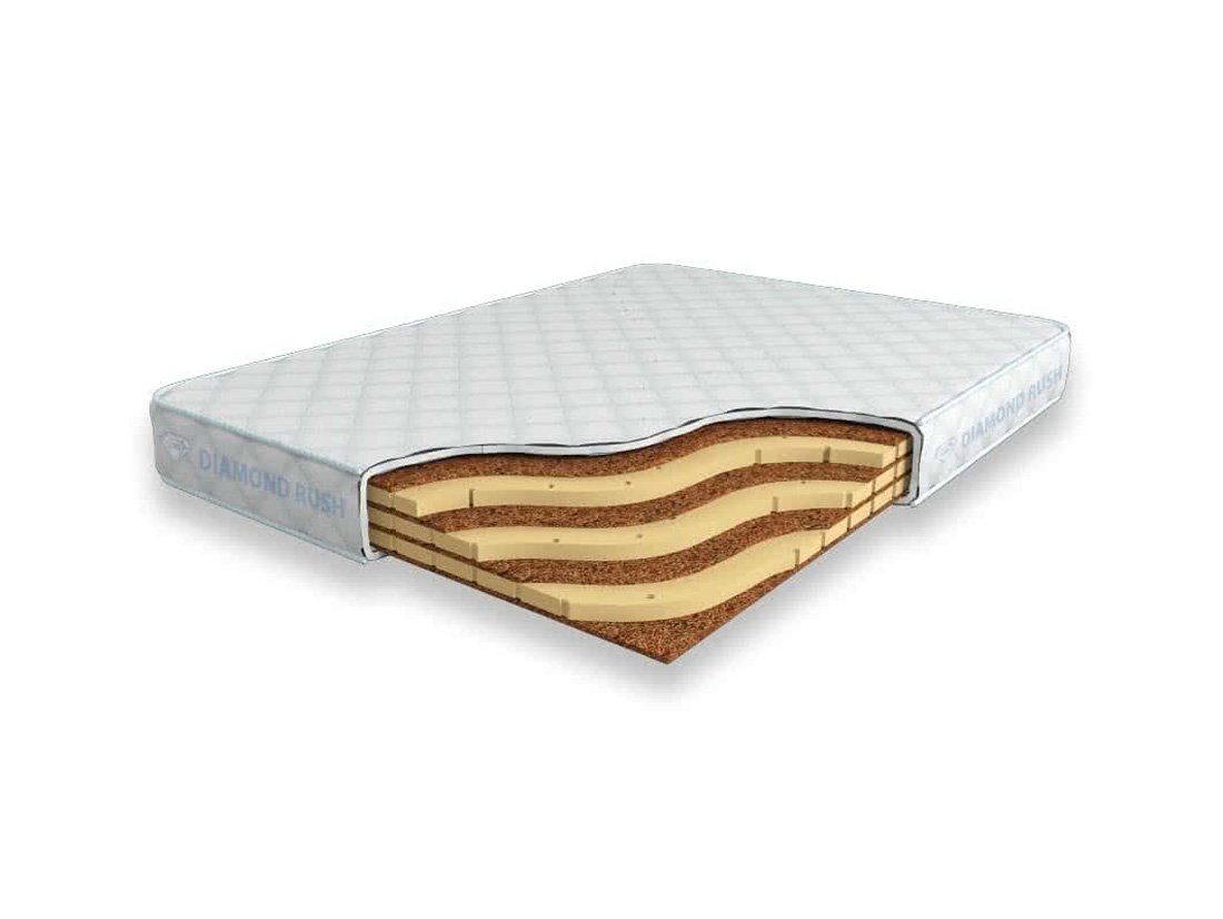 Матрас Diamond Rush Mono Mix Cocos 13 DR является беспружинным, т.е. не имеет в своей основе пружинного блока. В его состав входят одно или несколько чередований слоев латексированной кокосовой койры (1см) и натурального латекса с перфорацией (3см). Такая модель матраса относится к среднежестким и обладает ортопедическим эффектом.