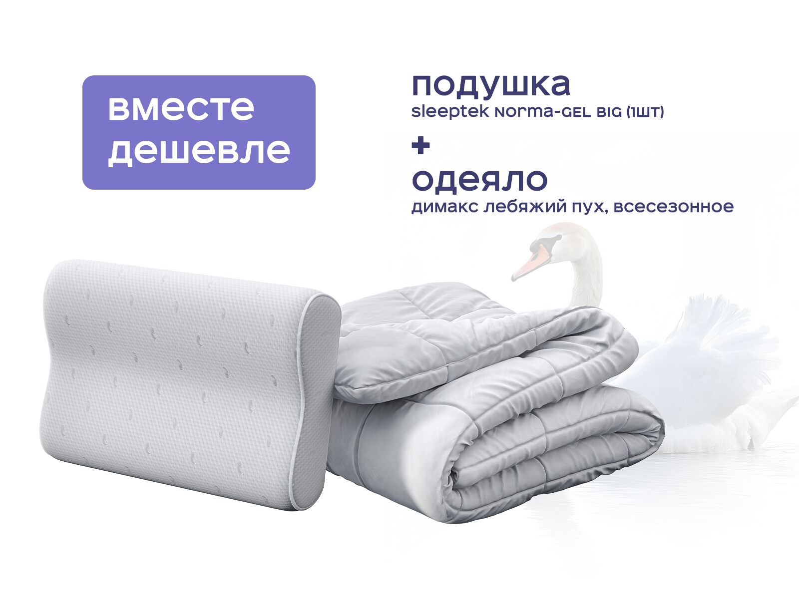 Комплект одеяло Димакс Лебяжий пух всесезонное + подушка Sleeptek Norma-GEL BIG 1 шт. — идеальное сочетание гипоаллергенного комфорта и инновационного охлаждения для тех, кто заслуживает сна без компромиссов. Покупая набор, вы экономите до 38% и получаете пышное одеяло с терморегуляцией для чувствительной кожи и анатомическую подушку с гелевым охлаждением, которые вместе создают условия для глубокого восстановления. Погрузитесь в комфортный сон вместе с готовым комплектом.