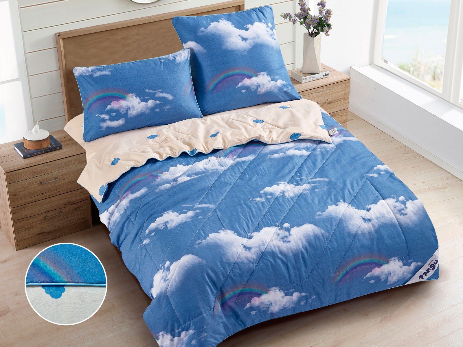 В данный комплект вместо пододеяльника входит облегченное одеяло. Комплект подойдет тем, кто устал от мучительного натягивания пододеяльников на одеяло.